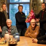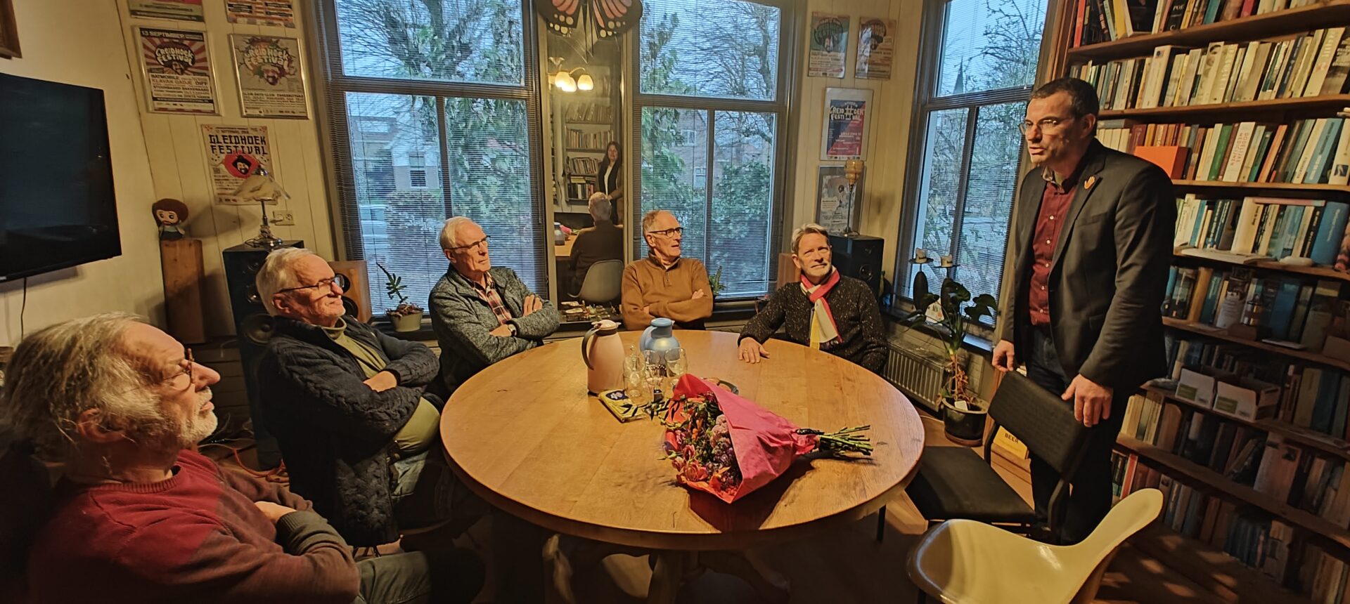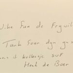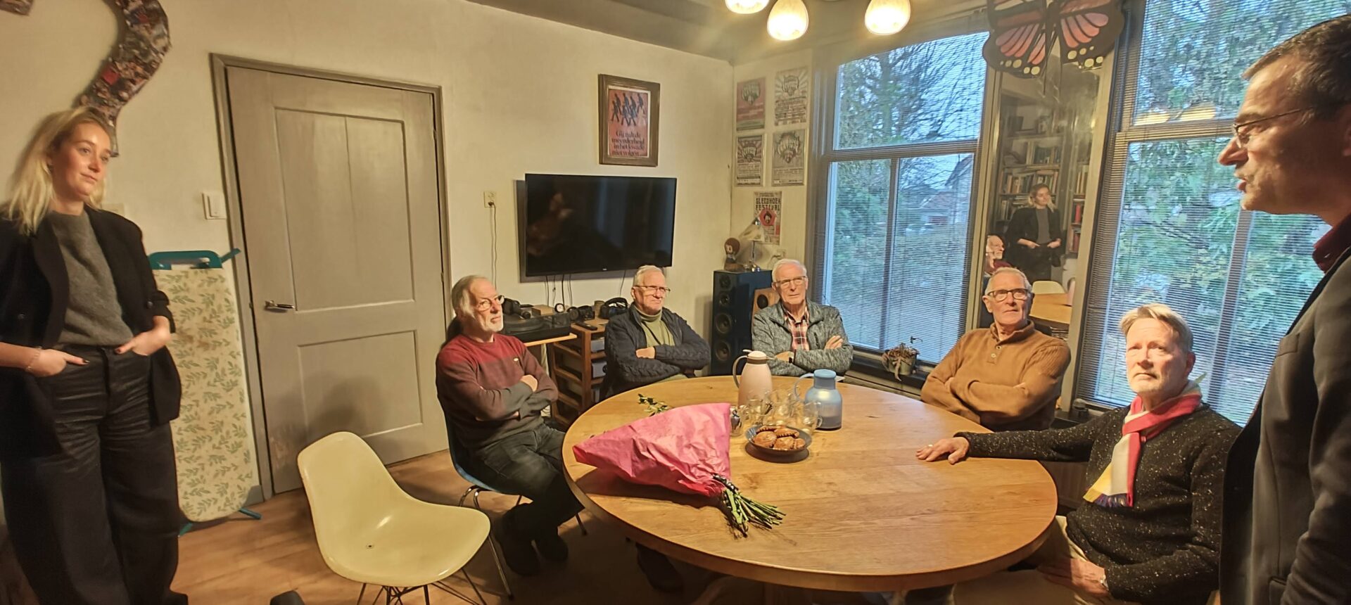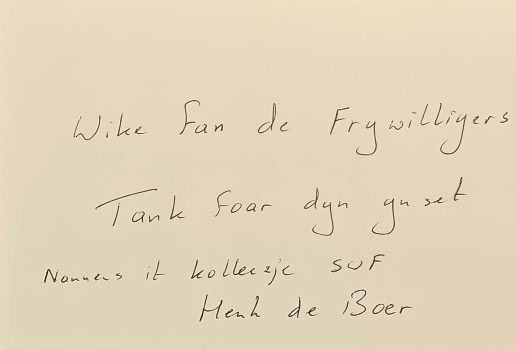 Op de foto’s ontbreken Klaas Molenmaker, Eelke Malda, Janny Brandsma en Rienk Wiersma. Die konden er niet bij zijn. Gemeentemedewerkster Richt Fokkens, binnenkort Wommelsster, staat er wel op. Ook het stuk in de Op ‘e Skille en de kaart die we bij de bloemen kregen staan hieronder op de foto.