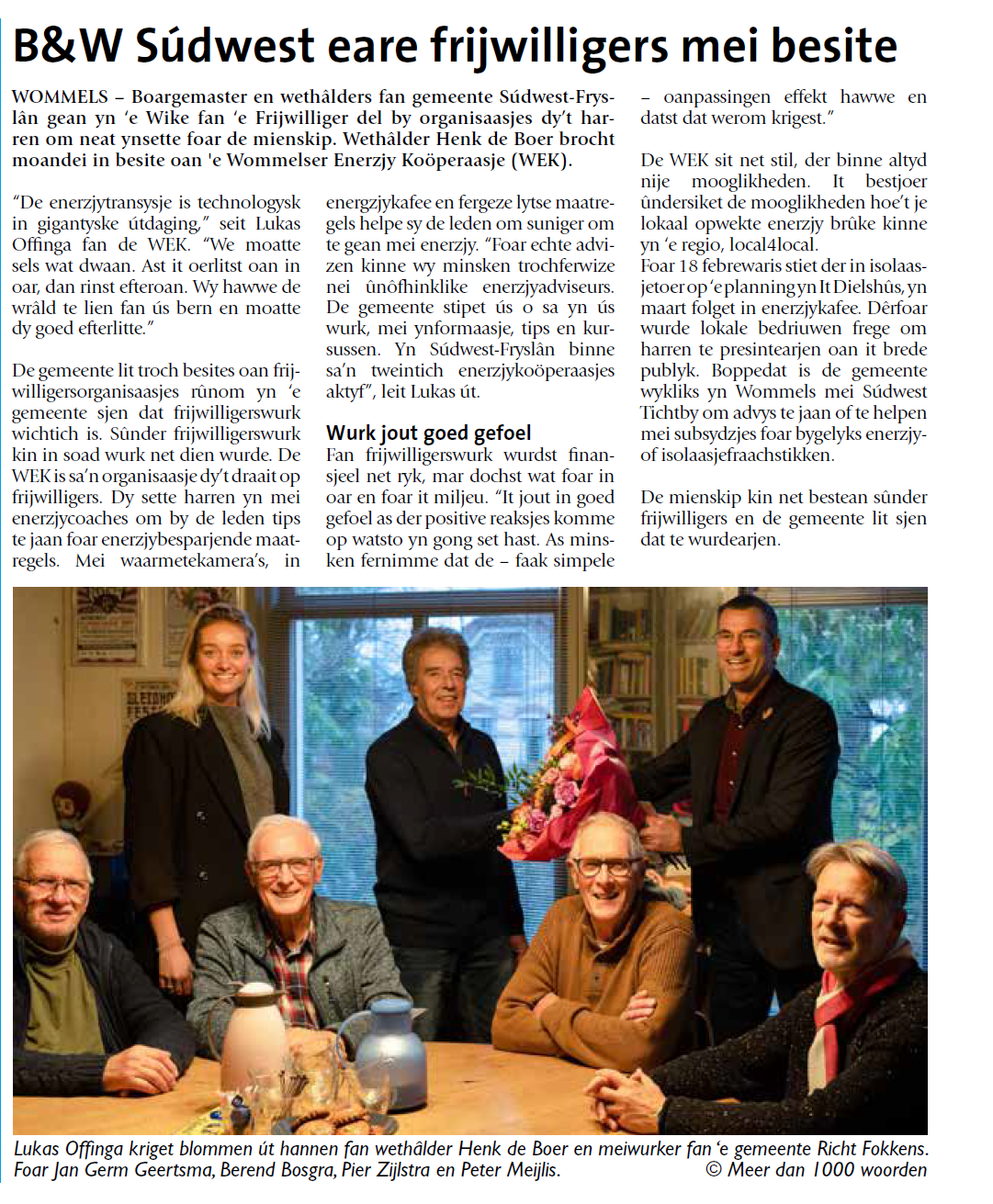 In de week van de vrijwilliger kwam wethouder Henk de Boer van Súdwest Fryslân bij ons langs om ons in het zonnetje te zetten voor het goede werk dat wij in Wommels hebben gedaan. Wij zijn met onze energiecoaches en warmtescanners en onze activiteiten met isolatiemaatregelen en -subsidies een van de meest actieve energiecoöperaties in de gemeente. De gemeente waardeert dit zeer en werkt hier zelf ook goed aan mee. Na onze actie met kleien energiebesparende maatregelen hadden we vorig jaar de NIP isolatie actie en ons energiecafé. De actie Nationaal Isolatie Plan (NIP) wordt volgend jaar doorgezet met nog steeds € 1800,- subsidie voor isolatie, maar nu met een verhoogde WOZ-waarde tot € 350.000 om er voor in aanmerking te komen. 18 Februari de Isolatietour in It Dielshûs. En in maart hopen wij het energiecafé een vervolg te geven. Energiecoaching en warmtescans doen we nog steeds graag, even een mailtje (info@wekwommels.nl) of belletje (0620343380) en we maken een afspraak. Ook als je hulp nodig hebt om over te stappen naar onze energieleverancier Energie VanOns (€ 75,- per jaar voor Wommels, onze energiepremieregeling voor jezelf, 100 % groen voor het milieu) komen we graag langs.
